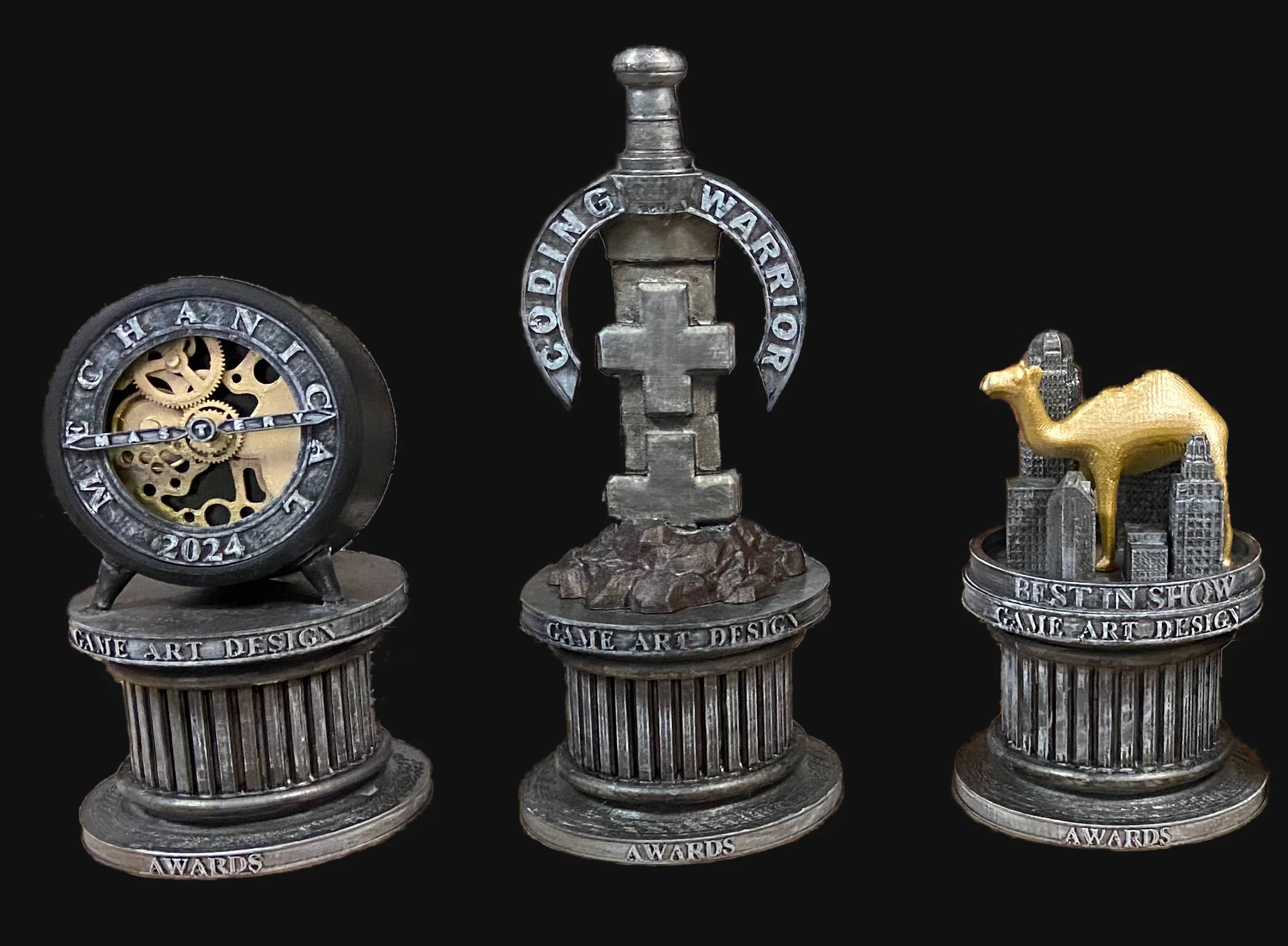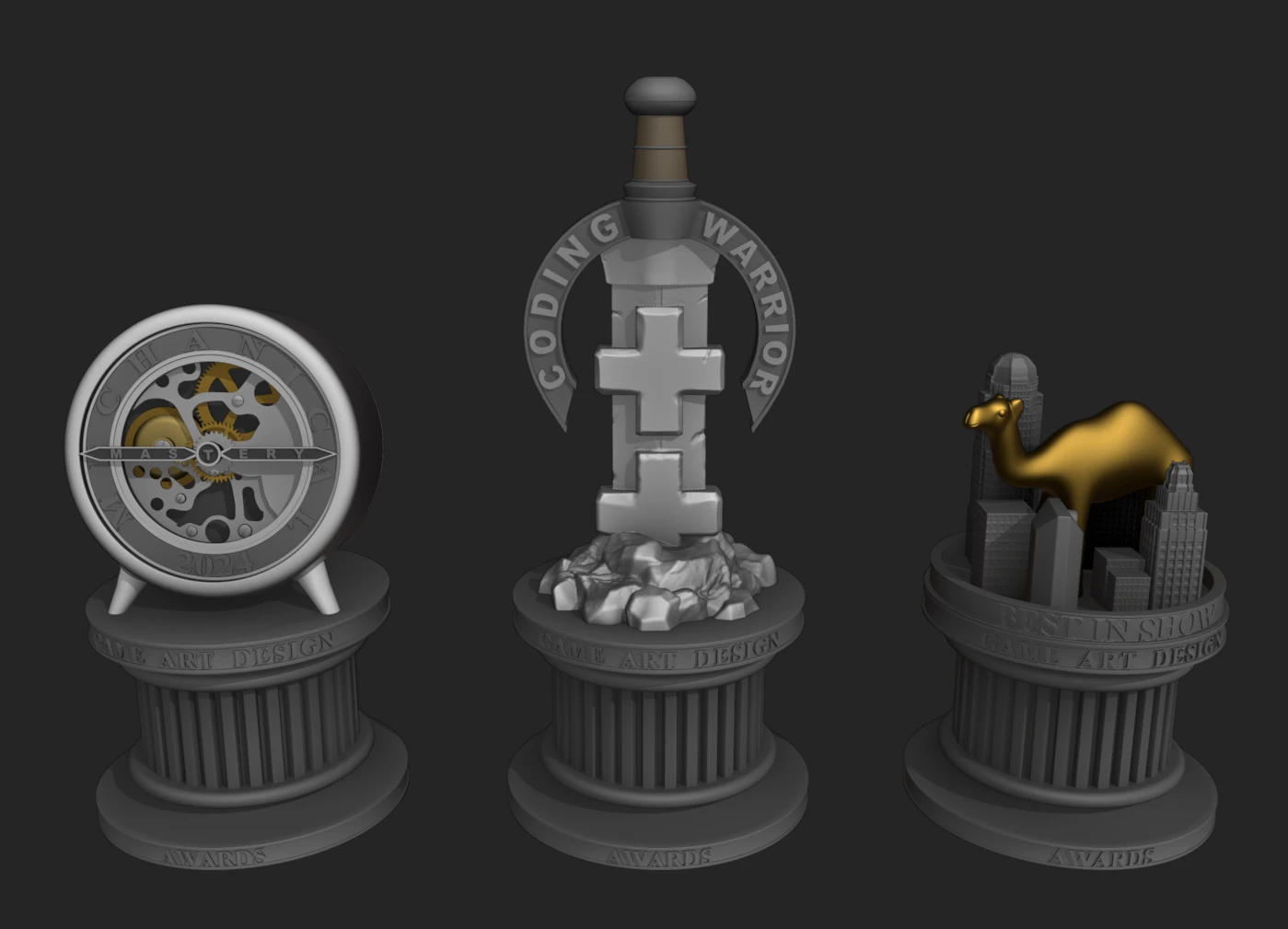 Camel City Game Jam is an annual game jam for high school students. I created these three trophy models from the event with the help of concept art and ideas provided by other students. I then helped with the printing and assembly of the trophy models.